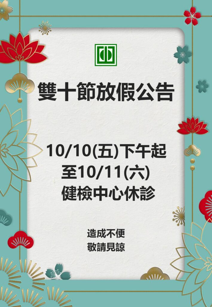 10/10(五)下午起至10/11(六)健檢中心休診 造成不便敬請見諒